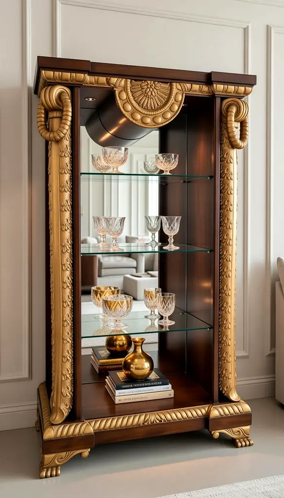 The tall display cabinet features a dark wood or distressed finish body, contrasted by prominent,
