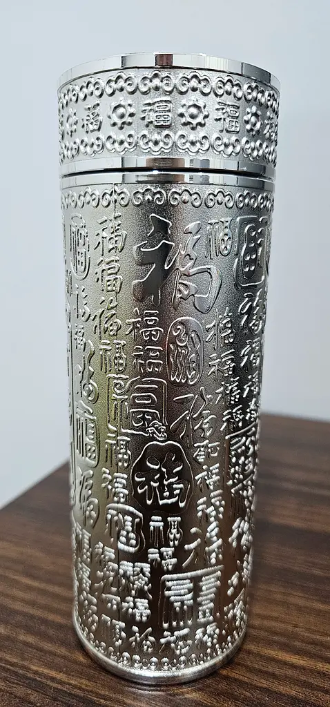 I am selling this stunning Antique style Silver color Bottle that would make a remarkable addition to any collection of unique artifacts. This beautifully crafted piece features intricate hieroglyphics engraved all around, showcasing the rich history and artistry of ancient Egypt. It’s in excellent condition despite being a collectible, having been well cared for over its two to five years of existence. This silver cup reflects a perfect blend of cultural significance and aesthetic appeal, making it not just a great decorative piece but also a conversation starter.