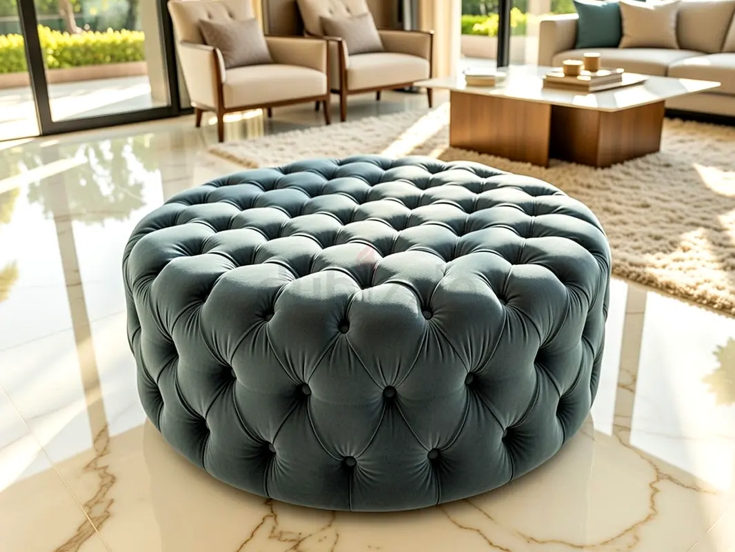 Its plush button-tufted design offers both elegance and comfort — perfect as a statement centerpiece, footrest, or stylish extra seating.