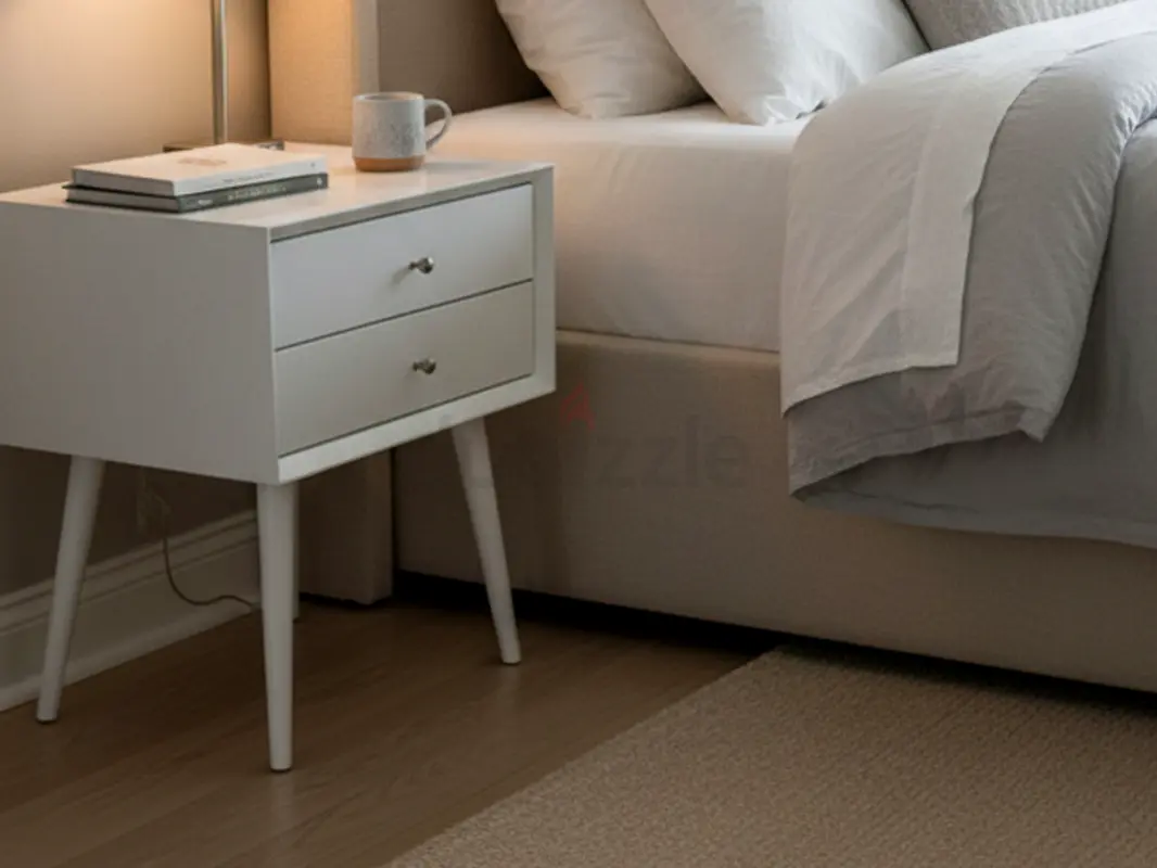 A sleek, mid-century modern nightstand in a crisp white lacquer finish.
