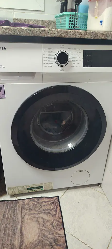 I'm selling my Toshiba front-load washing machine in white. It's about 2–5 years old and in good working condition. I used it for normal household washing and it still operates well. There are normal signs of use consistent with its age, but no major issues.